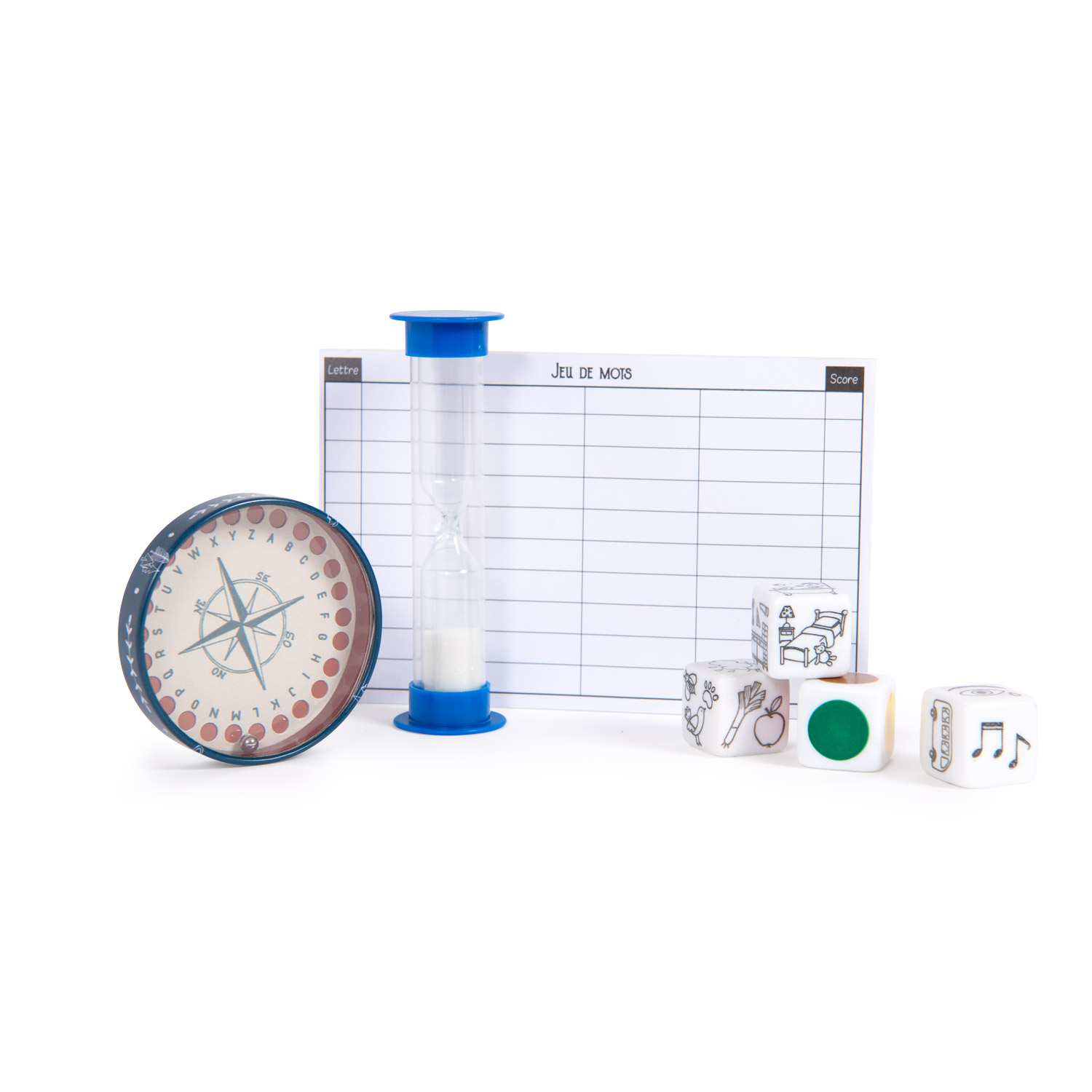 Materials/fabrics: Product includes score sheets, alphabet compass, hourglass and 4 themed die
