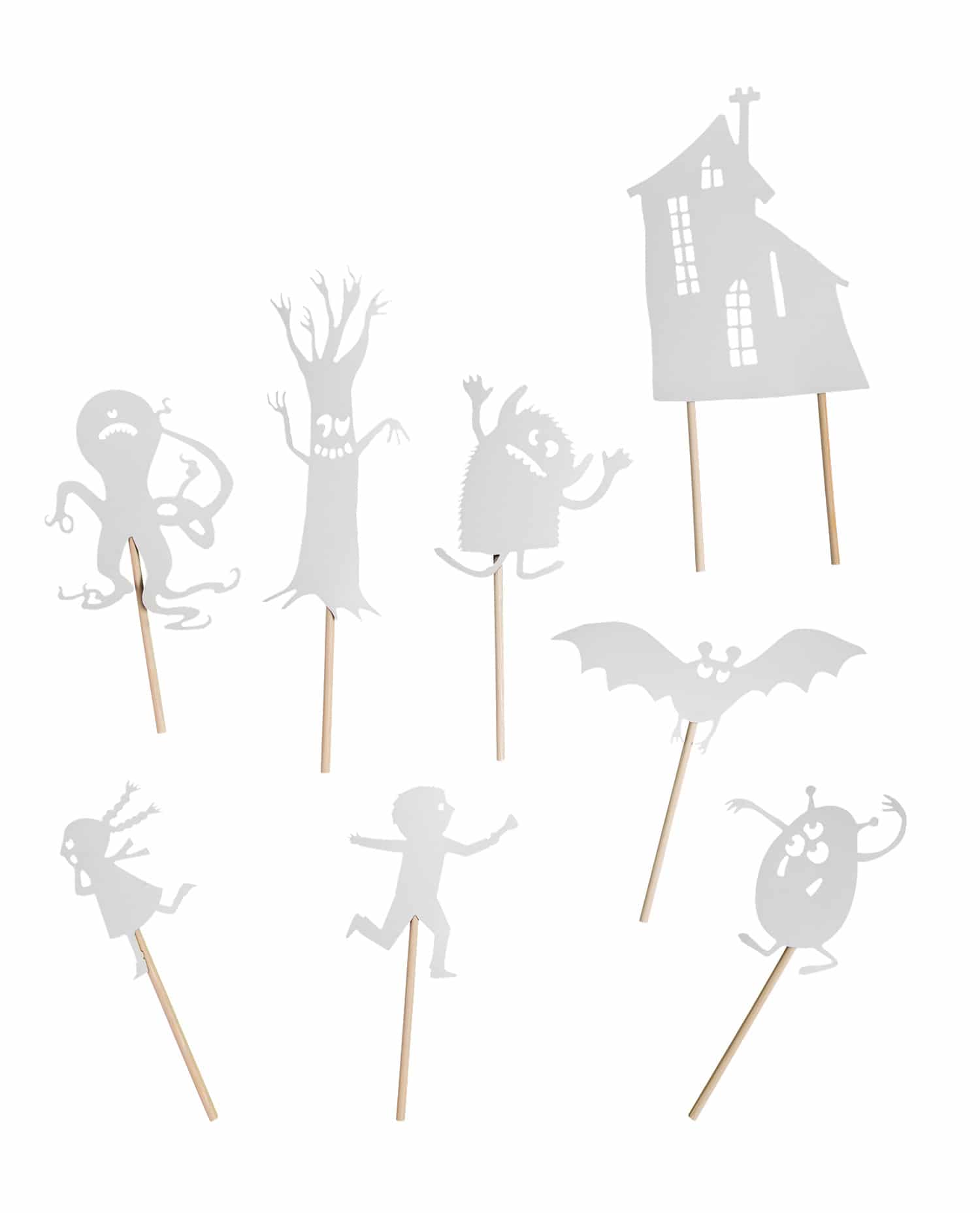 Features: Black card silhouettes on wooden picks, this version glows in the dark