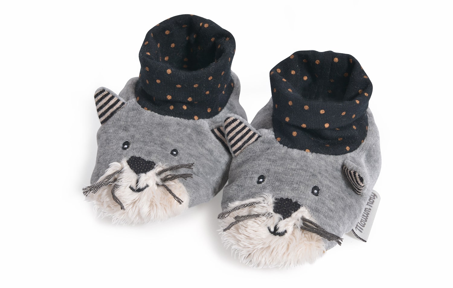 Features: Embroidered cat face, ears, jersey sock cuff