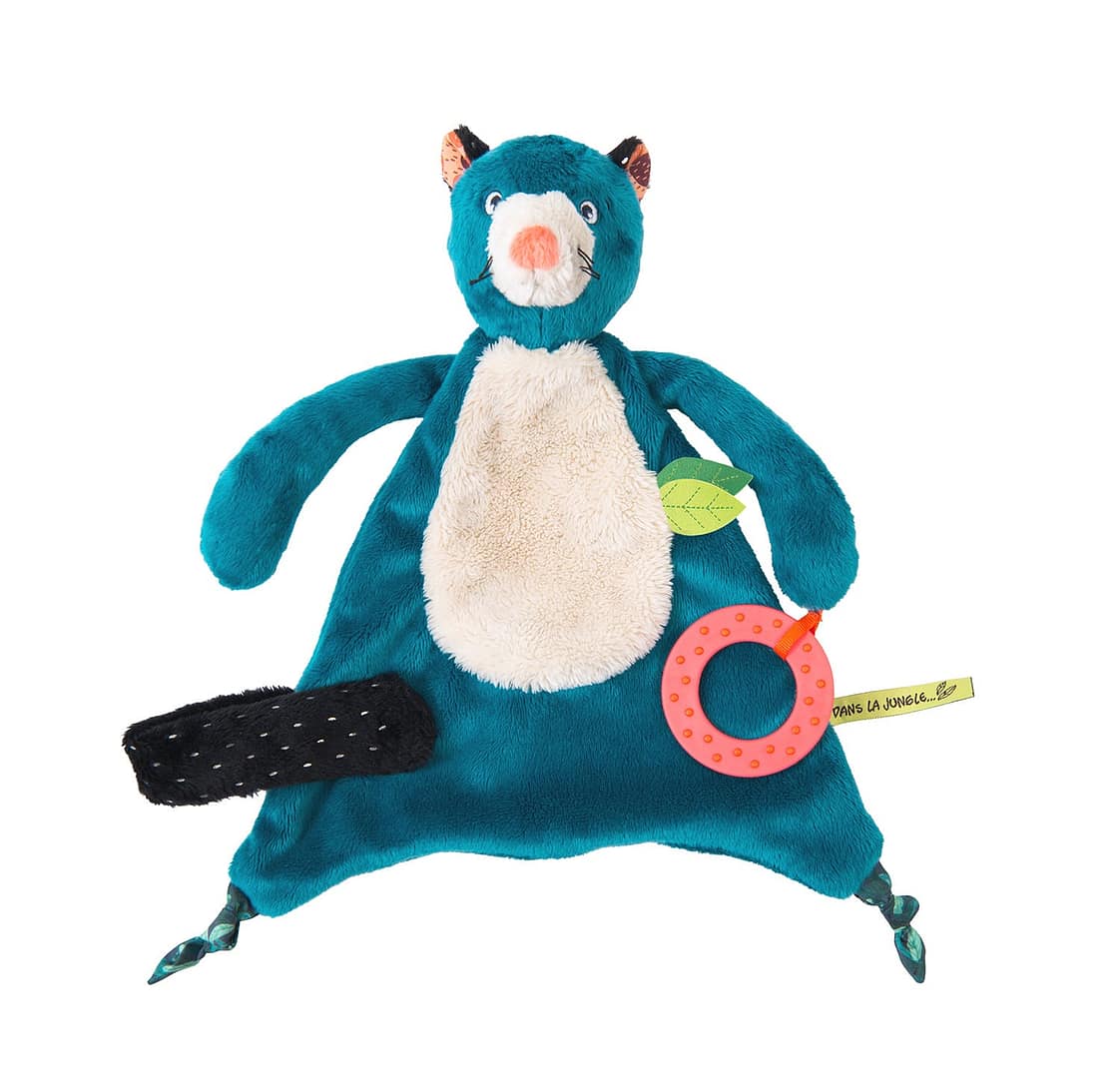 Features: Knotted taggy feet, velcro dummy strap, teether ring